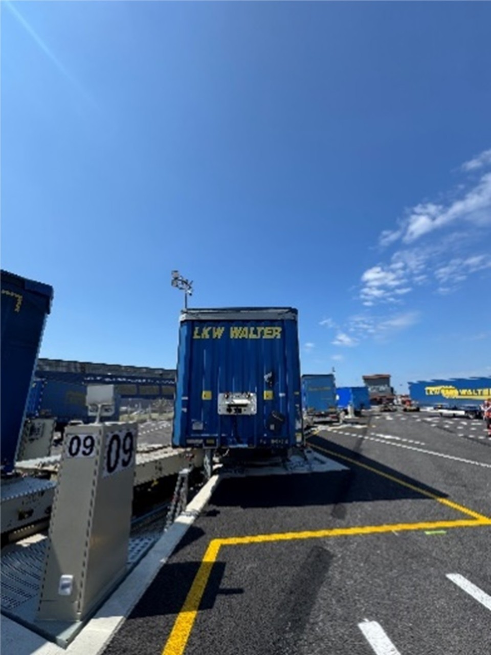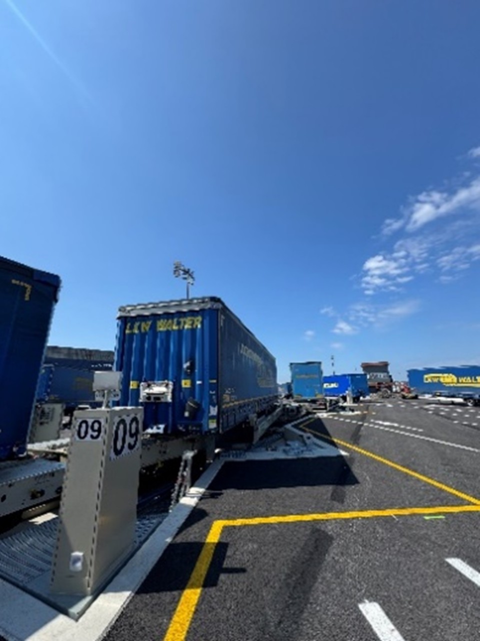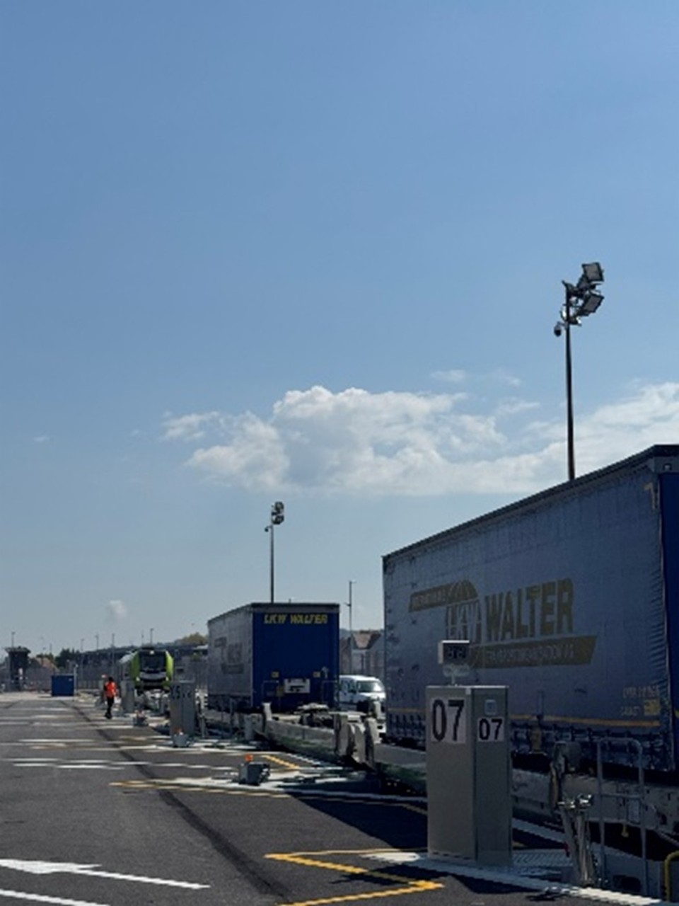 The terminal uses LOHR technology, allowing multiple trailers to be loaded/unloaded simultaneously onto trains up to 750 metres long.